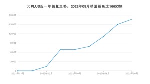 2022年8月,元PLUS销量为16653辆,环比增长11.1%。2021年08月-2022年08月份,元PLUS销量为65685辆,