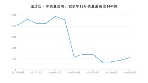 2022年8月,途达销量为333辆,同比下降72.95%,环比增长27.59%。2021年08月-2022年08月份,途达销量为10214辆,同比下降41.13%。