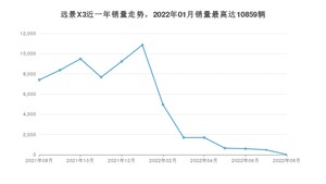 2022年8月,远景X3销量为24辆,同比下降99.68%,环比下降95.01%。2021年08月-2022年08月份,远景X3销量为63132辆,同比下降39.58%。