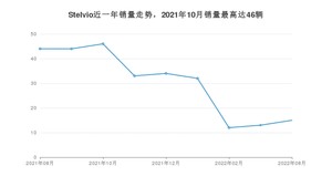 2022年8月,Stelvio销量为15辆,同比下降65.91%,环比增长15.38%。2021年08月-2022年08月份,Stelvio销量为273辆,同比下降49.35%。