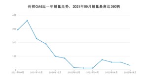 2022年8月,传祺GA6销量为32辆,同比下降89.08%,环比下降42.86%。2021年08月-2022年08月份,传祺GA6销量为1514辆,同比下降81.31%。