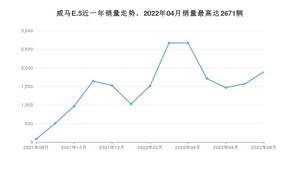 2022年8月,威马E.5销量为1893辆,同比增长2%,环比增长20.65%。2021年08月-2022年08月份,威马E.5销量为19242辆,同比增长23%。