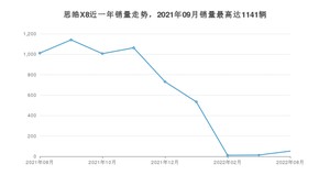 2022年8月,思皓X8销量为52辆,同比下降94.86%,2021年08月-2022年08月份,思皓X8销量为5562辆,同比下降57.78%。