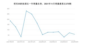 2022年8月,领克05新能源销量为57辆,同比下降69.19%,环比下降20.83%。2021年08月-2022年08月份,领克05新能源销量为1488辆,同比增长704.32%。