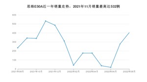 2022年8月,思皓E50A销量为404辆,同比增长71.91%,环比增长45.85%。2021年08月-2022年08月份,思皓E50A销量为3375辆,同比增长468.18%。