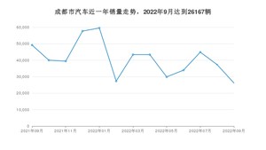2022年9月,成都市汽车总销量为26167辆,同比下降46.82%,环比下降29.89%。2021年09月-2022年09月份,成都市总销量为532207辆,同比下降9.67%。在最近1年中,成都市销量在2022年01月达到最高,销量为59547辆。