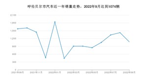 2022年9月,呼伦贝尔市汽车总销量为1074辆,同比下降31.72%,环比下降24.68%。2021年09月-2022年09月份,呼伦贝尔市总销量为14929辆,同比下降31.21%。在最近1年中,呼伦贝尔市销量在2022年01月达到最高,销量为1838辆。