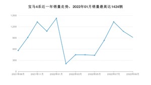 2022年9月,宝马4系销量为914辆,同比增长62.63%,环比下降15.13%。2021年09月-2022年09月份,宝马4系销量为10985辆,同比增长30.32%。