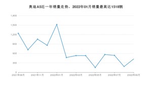 2022年9月,奥迪A5销量为424辆,同比下降65.7%,环比增长131.69%。2021年09月-2022年09月份,奥迪A5销量为8778辆,同比下降47.6%。