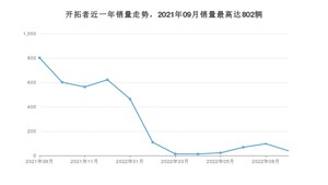 2022年9月,开拓者销量为39辆,同比下降95.14%,环比下降59.79%。2021年09月-2022年09月份,开拓者销量为3413辆,同比下降59.97%。