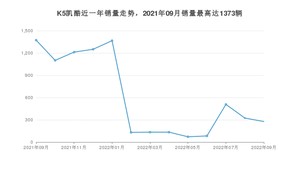 2022年9月,K5凯酷销量为277辆,同比下降79.83%,环比下降14.51%。2021年09月-2022年09月份,K5凯酷销量为7965辆,同比下降64.49%。