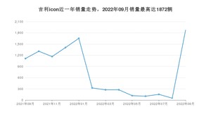 2022年9月,吉利icon销量为1872辆,同比增长68.35%,环比增长3%。2021年09月-2022年09月份,吉利icon销量为9815辆,同比下降51.28%。