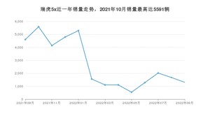 2022年9月,瑞虎5x销量为1305辆,同比下降71.67%,环比下降22.18%。2021年09月-2022年09月份,瑞虎5x销量为35024辆,同比下降39.11%。