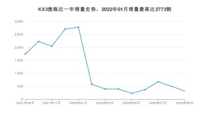 2022年9月,KX3傲跑销量为318辆,同比下降81.82%,环比下降36.27%。2021年09月-2022年09月份,KX3傲跑销量为14955辆,同比下降58.7%。