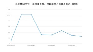 2022年9月,风光MINIEV销量为254辆,环比下降13.61%。2021年09月-2022年09月份,风光MINIEV销量为3774辆,