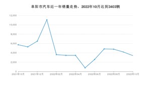 2022年10月,阜阳市汽车总销量为3403辆,同比下降40.53%,环比下降18.59%。2021年10月-2022年10月份,阜阳市总销量为59611辆,同比下降24.65%。在最近1年中,阜阳市销量在2022年01月达到最高,销量为11069辆。