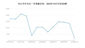 2022年10月,包头市汽车总销量为250辆,同比下降92.66%,环比下降90.74%。2021年10月-2022年10月份,包头市总销量为31963辆,同比下降32.42%。在最近1年中,包头市销量在2021年12月达到最高,销量为4180辆。