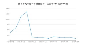 2022年10月,陇南市汽车总销量为106辆,同比下降76.91%,环比下降38.73%。2021年10月-2022年10月份,陇南市总销量为5606辆,同比下降41.97%。在最近1年中,陇南市销量在2022年01月达到最高,销量为1616辆。