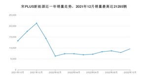 2022年10月,宋PLUS新能源销量为9599辆,同比下降27.45%,环比增长21.57%。2021年10月-2022年10月份,宋PLUS新能源销量为135781辆,同比增长171.58%。