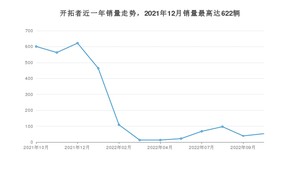 2022年10月,开拓者销量为53辆,同比下降91.18%,环比增长35.9%。2021年10月-2022年10月份,开拓者销量为2664辆,同比下降68.3%。