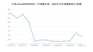 2022年10月,天逸 C5 AIRCROSS销量为156辆,同比下降77.84%,环比下降38.58%。2021年10月-2022年10月份,天逸 C5 AIRCROSS销量为3378辆,同比下降67.69%。
