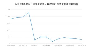 2022年10月,马自达CX-30销量为297辆,同比下降83.49%,环比下降19.73%。2021年10月-2022年10月份,马自达CX-30销量为11258辆,同比下降45.57%。