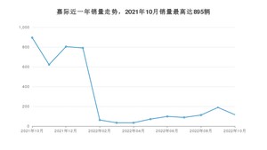 2022年10月,嘉际销量为116辆,同比下降87.04%,环比下降38.62%。2021年10月-2022年10月份,嘉际销量为3916辆,同比下降80.63%。