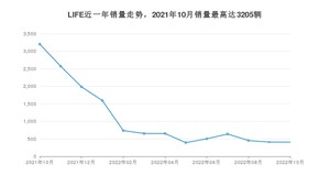 2022年10月,LIFE销量为407辆,同比下降87.3%,环比下降0.49%。2021年10月-2022年10月份,LIFE销量为14210辆,同比下降41.55%。