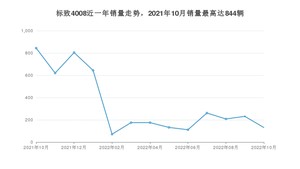 2022年10月,标致4008销量为131辆,同比下降84.48%,环比下降43.29%。2021年10月-2022年10月份,标致4008销量为4407辆,同比下降47.67%。