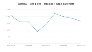 2022年10月,远景X6销量为1643辆,环比下降11.33%。2021年10月-2022年10月份,远景X6销量为15212辆,同比下降78%。