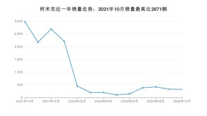 2022年10月,柯米克销量为319辆,同比下降89.26%,环比下降3.04%。2021年10月-2022年10月份,柯米克销量为12583辆,同比下降70.38%。