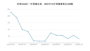 2022年10月,传祺GA6销量为30辆,同比下降86.84%,环比下降46.43%。2021年10月-2022年10月份,传祺GA6销量为947辆,同比下降86.65%。