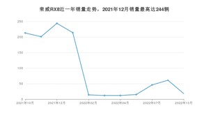 2022年10月,荣威RX8销量为18辆,同比下降91.55%,2021年10月-2022年10月份,荣威RX8销量为1050辆,同比下降69.11%。