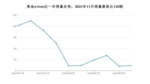 2022年10月,奥迪e-tron销量为14辆,同比下降88.52%,环比增长16.67%。2021年10月-2022年10月份,奥迪e-tron销量为564辆,同比增长51.61%。