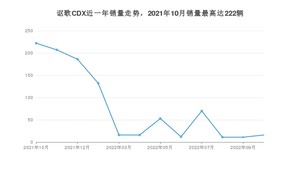 2022年10月,讴歌CDX销量为16辆,同比下降92.79%,环比增长45.45%。2021年10月-2022年10月份,讴歌CDX销量为952辆,同比下降79.48%。