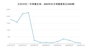 2022年10月,北京X7销量为59辆,同比下降96.66%,环比下降43.81%。2021年10月-2022年10月份,北京X7销量为9224辆,同比下降63.11%。