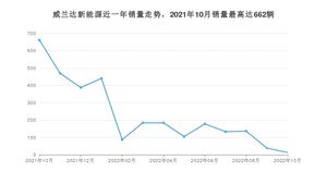 2022年10月,威兰达新能源销量为13辆,同比下降98.04%,环比下降65.79%。2021年10月-2022年10月份,威兰达新能源销量为3018辆,同比下降89.27%。