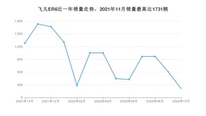 2022年10月,飞凡ER6销量为206辆,同比下降83.91%,环比下降66.17%。2021年10月-2022年10月份,飞凡ER6销量为11993辆,同比增长38.22%。