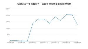 2022年10月,风光E1销量为1286辆,同比增长1%,环比下降38.62%。2021年10月-2022年10月份,风光E1销量为15310辆,同比增长945.05%。