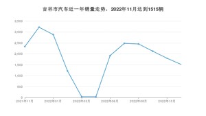 2022年11月,吉林市汽车总销量为1515辆,同比下降35.12%,环比下降15.83%。2021年11月-2022年11月份,吉林市总销量为22019辆,同比下降37.06%。在最近1年中,吉林市销量在2021年12月达到最高,销量为3219辆。