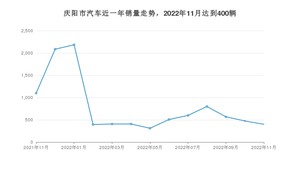 2022年11月,庆阳市汽车总销量为400辆,同比下降63.6%,环比下降15.79%。2021年11月-2022年11月份,庆阳市总销量为10236辆,同比下降47.16%。在最近1年中,庆阳市销量在2022年01月达到最高,销量为2184辆。