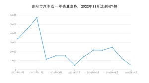 2022年11月,邵阳市汽车总销量为474辆,同比下降86.06%,环比下降62.11%。2021年11月-2022年11月份,邵阳市总销量为28211辆,同比下降39.31%。在最近1年中,邵阳市销量在2022年01月达到最高,销量为5732辆。