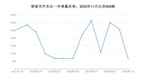 2022年11月,晋城市汽车总销量为606辆,同比下降76.51%,环比下降76.65%。2021年11月-2022年11月份,晋城市总销量为23495辆,同比下降26.62%。在最近1年中,晋城市销量在2022年07月达到最高,销量为3117辆。