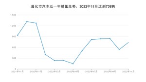 2022年11月,通化市汽车总销量为736辆,同比下降21.37%,环比增长37.06%。2021年11月-2022年11月份,通化市总销量为8815辆,同比下降41.09%。在最近1年中,通化市销量在2021年12月达到最高,销量为1315辆。