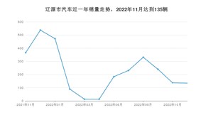 2022年11月,辽源市汽车总销量为135辆,同比下降63.11%,环比下降1.46%。2021年11月-2022年11月份,辽源市总销量为2749辆,同比下降57.9%。在最近1年中,辽源市销量在2021年12月达到最高,销量为537辆。
