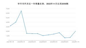 2022年11月,毕节市汽车总销量为2059辆,同比下降35.84%,环比增长221.22%。2021年11月-2022年11月份,毕节市总销量为26896辆,同比下降34.34%。在最近1年中,毕节市销量在2022年01月达到最高,销量为6494辆。