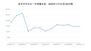2022年11月,昆明市汽车总销量为14937辆,同比下降18.77%,环比增长2.7%。2021年11月-2022年11月份,昆明市总销量为207230辆,同比下降20.52%。在最近1年中,昆明市销量在2022年01月达到最高,销量为26465辆。