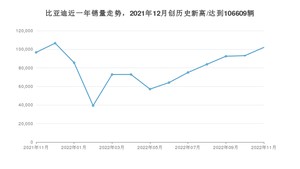在国内市场上,比亚迪,在2022年11月的销量为102040辆,同比增长5.54%,环比增长9.56%。2021年11月-2022年11月份,比亚迪累计销量为1041620辆,较去年同期增长33.15%。