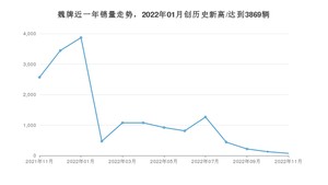 在国内市场上,魏牌,在2022年11月的销量为71辆,同比下降97.24%,环比下降44.09%。2021年11月-2022年11月份,魏牌累计销量为16351辆,较去年同期增长66.51%。