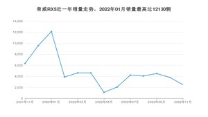 2022年11月,荣威RX5销量为2486辆,同比下降60.86%,环比下降34.78%。2021年11月-2022年11月份,荣威RX5销量为63450辆,同比下降34.51%。